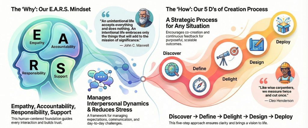 Transformation Design is our interdisciplinary method for co-creating delightful experiences in both product and life. We combine our strategic 5 D’s of Creation process with our empathetic E.A.R.S. mindset to manage expectations, reduce stress, and restore your time and energy—helping connect the dots between a great idea and a successful outcome.